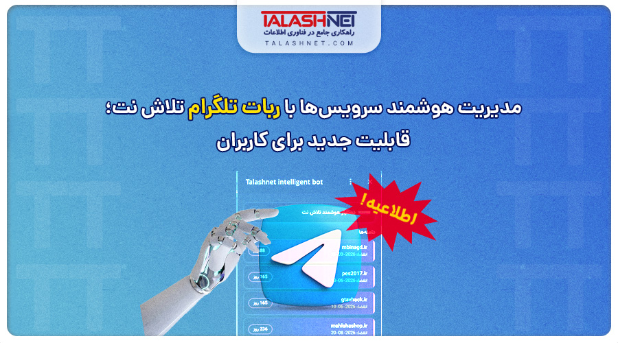 راهاندازی ربات تلگرام تلاشنت نشاندهنده تعهد این مجموعه به ارائه خدمات نوین و احترام به زمان کاربران است. با فعالسازی این قابلیت، مدیریت داراییهای آنلاین شما سادهتر، سریعتر و هوشمندتر خواهد شد. پیشنهاد میشود تمامی کاربران برای جلوگیری از فراموشی تاریح انقضای سرویسها و دسترسی آسانتر به اطلاعات، همین امروز نسبت به دریافت توکن و فعالسازی این ربات اقدام نمایند.